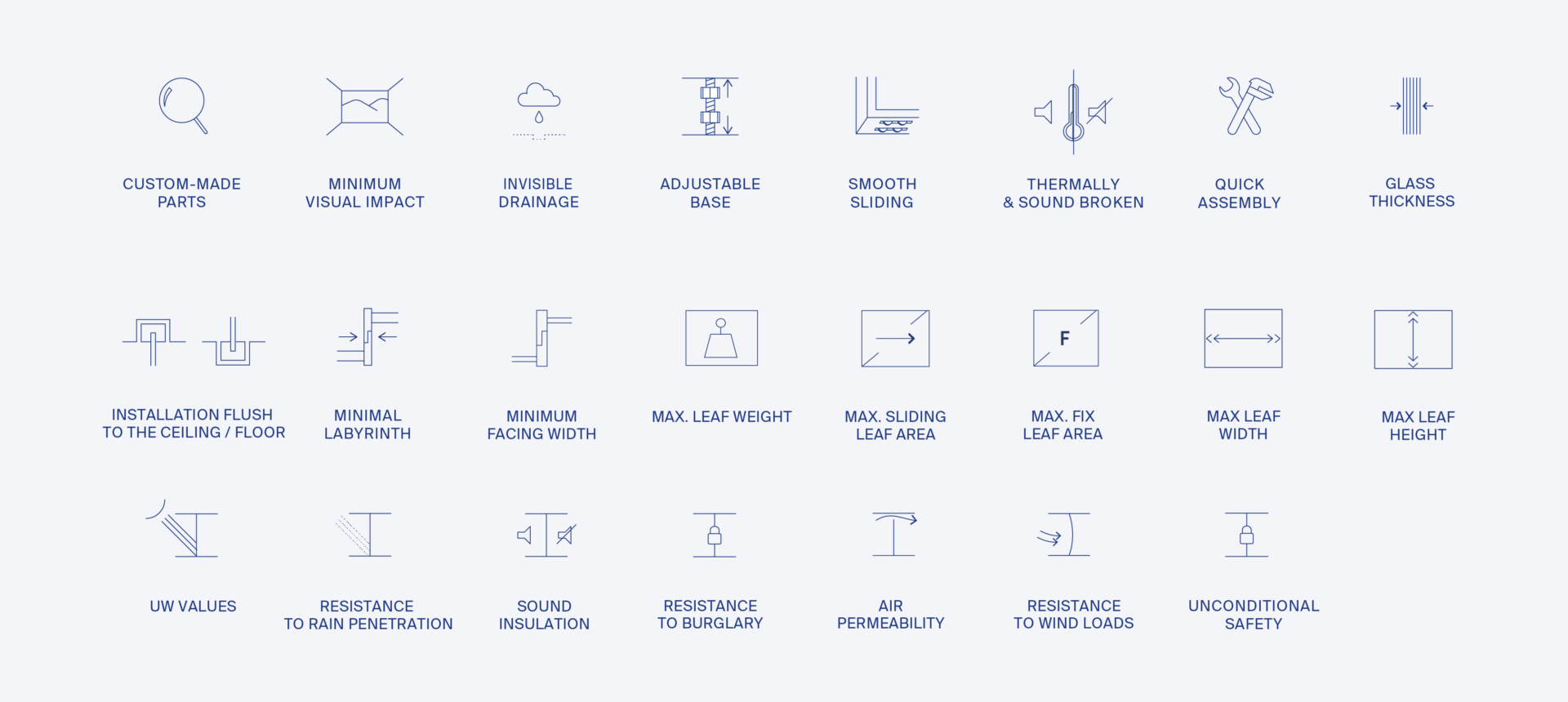 A set of custom graphics is used to present system highlights and certifications. These icons appear consistently across the Company Book, highlight brochures, and the website. To ensure clarity, they are always accompanied by the relevant name.