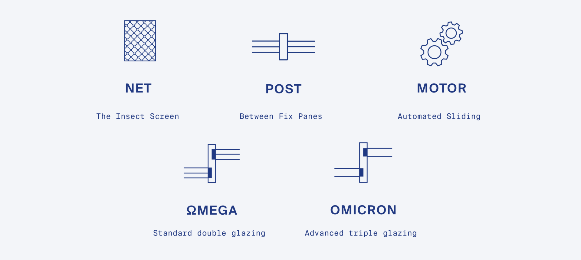 Used in cases where we need to describe a system without the use of 3D visuals, primarily in technical drawings. These icons are featured in the Company Book and highlight brochures, among other applications and are always accompanied by the system description.